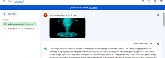 - قابلیت تحلیل عکس یا نوشتن محتوا در مورد آن (البته این قابلیت از زبان فارسی پشتیبانی نمیکند)