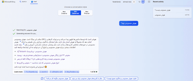 - ارائه پاسخها در حالت چت با سه گزینه متفاوت: این گزینهها شامل سه گزینه balanced و creative و precise را انتخاب کنند. در حالت balanced پاسخها دقیق خلاقانه، با اطلاعات جامع و در برخی از مواقع با جزئیات کافی برای درک بهتر هستند. در حالت creative پاسخها خلاقانه، داستانی و معمولاً جذاب و سرگرمکننده هستند. در این حالت گاهی اوقات هم اطلاعات دقیقی در مورد موضوع موردنظر ارائه میشود. در حالت precise پاسخها دقیق، مختصر، دارای اطلاعات اساسی و بدون جزئیات هستند.