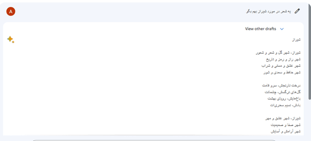 - خلاقیت بالا در ایجاد محتوا و ارائه ایده؛ این مدل مثلاً در ارائه شعر و قافیهبندی و جملهبندی، عملکرد بهتری نسبت به دو چت بات دیگر دارد؛ اما بارد در هنگام ایجاد شعر کلمات را دائماً تکرار میکند و توجهی به ریتم ندارد.